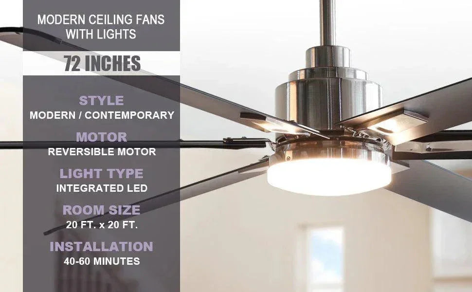 Great for large areas or lofts is this Kensgrove 72 in. Brushed Chrome ceiling fan. The powerful DC motor can cool a large room and push out 9,772 CFMs of cooling. It features a full-function 6-speed motor that is 3-times the power of a traditional ceiling fan. The included remote control allows you to control the light, and speed functions. The energy-efficient DC motor will start saving you on energy expenses while running on high, on only 36 watts.