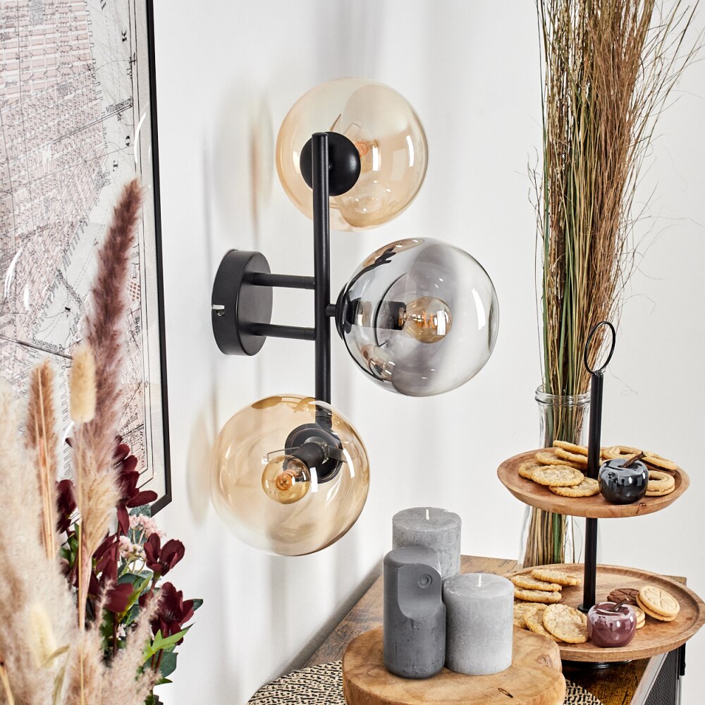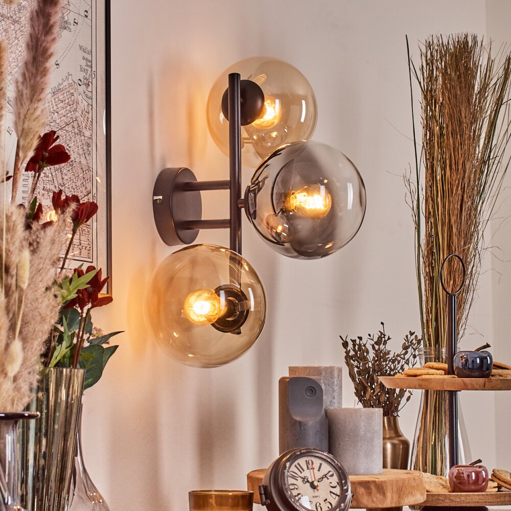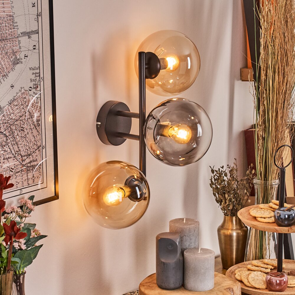 Inspiriert vom modernen Industriedesign, verfügt diese Wandleuchte über mehrere Rauchglas- und Klarglaskugeln, die mit einem eleganten schwarzen Metallrahmen kombiniert sind. Jede Kugel beherbergt eine warm leuchtende Glühbirne, wodurch ein mehrschichtiger und atmosphärischer Beleuchtungseffekt mit hochwertiger Ästhetik entsteht. Perfekt, um Wohn- und Schlafzimmern eine zeitgenössische und künstlerische Note zu verleihen, vereint sie Glas-Kunst mit markanter Metallverarbeitung und wird so zum Hingucker für Räume, die einen schicken, modernen Look mit industriellem Flair anstreben.