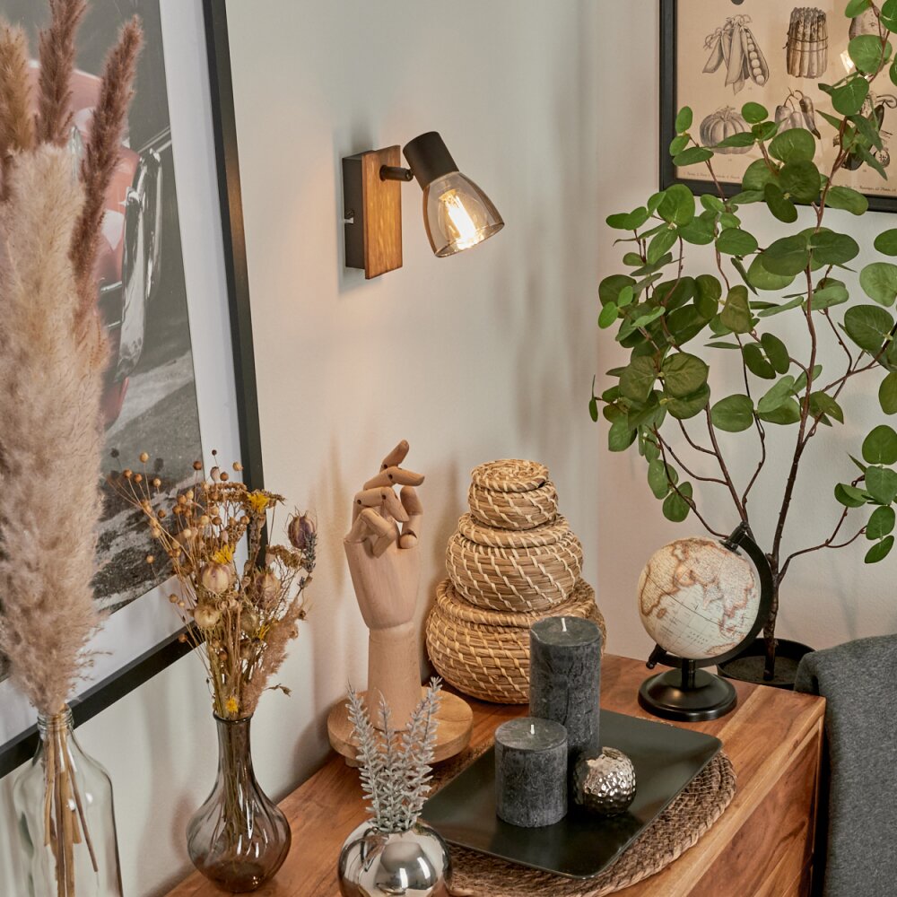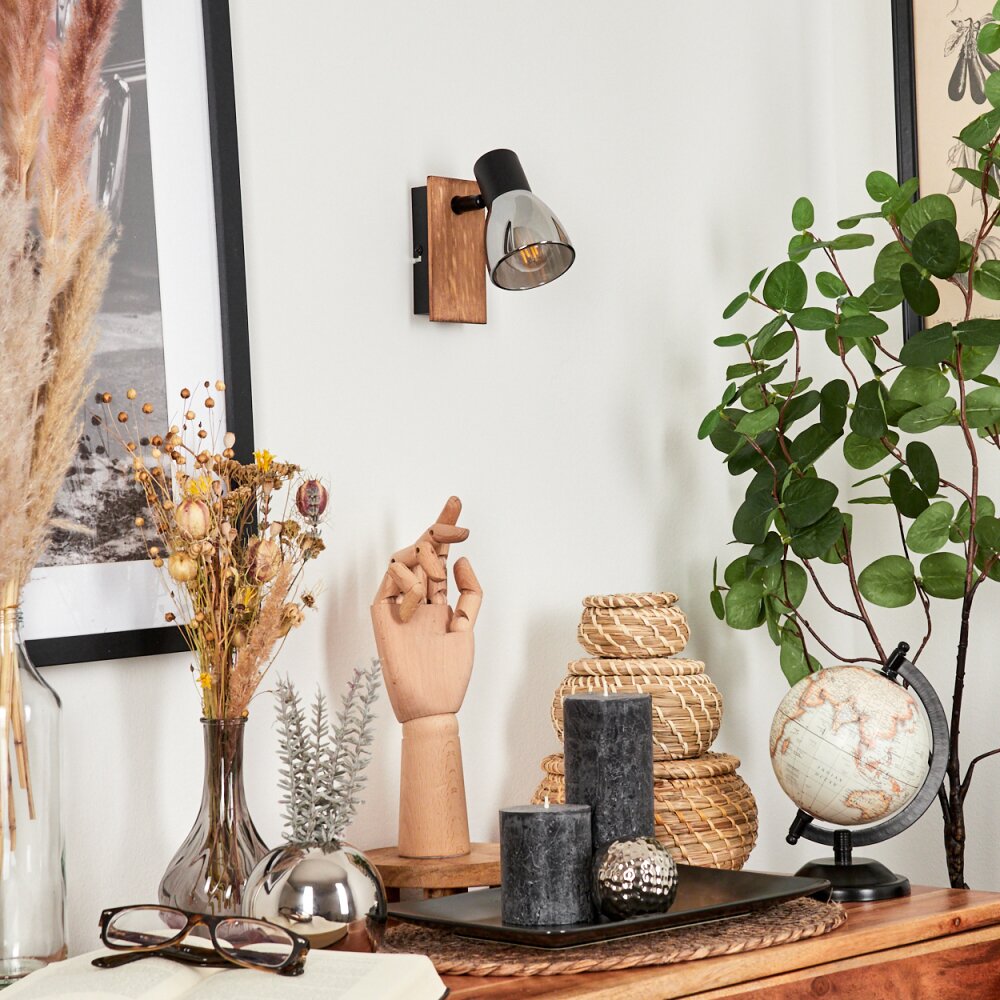 Inspiriert vom skandinavischen rustikalen Design, verfügt dieser Wandleuchtspot über eine Rückplatte aus Naturholz, kombiniert mit einem schwarzen Metall- und Klarglas-Lampenschirm. Die einzelne Lichtquelle wirft fokussiertes, warmes Licht und verbindet organische Holztextur mit industriellen Metallelementen. Der verstellbare Lampenkopf ermöglicht eine individuelle Ausrichtung und erzeugt gezieltes, stimmungsvolles Licht, das diesen Spot zu einem vielseitigen Akzent für Wohnzimmer, Schlafzimmer und Räume mit skandinavisch-rustikaler Ästhetik macht.