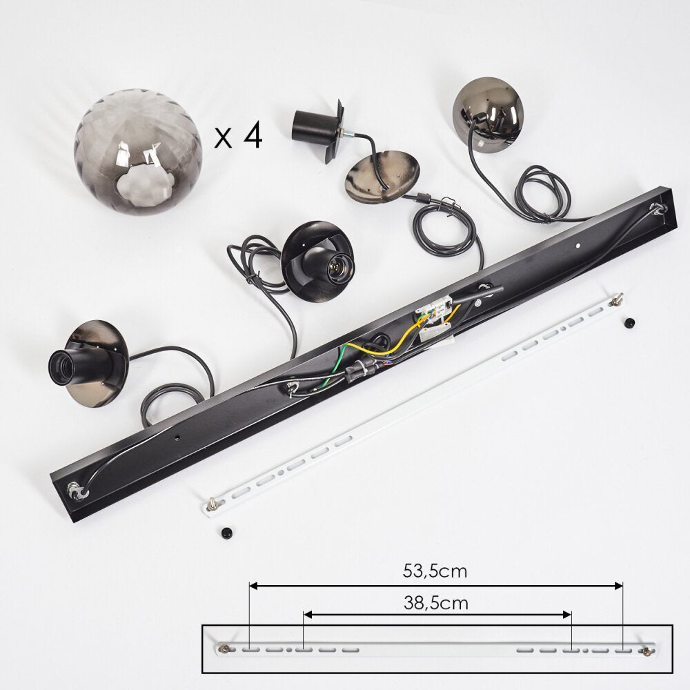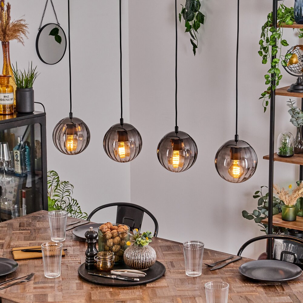 Inspired by contemporary design aesthetics, this Volene pendant light embraces the allure of smoky glass and sleek black accents. Crafted with textured glass and metal details, it showcases the art of modern lighting, resulting in a captivating interplay of soft transparency and bold lines. The four-light source arrangement adds a layer of elegance, making it a standout centerpiece for dining spaces and stylish interiors.