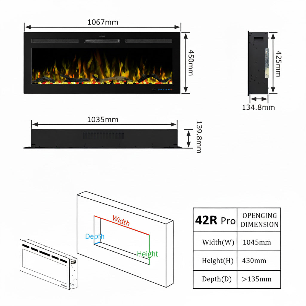 1067mm 42" EF42R Pro Einbau- oder Wandmontierter Elektrokamin mit 13 Flammenfarben und Fernbedienung 750/1500W