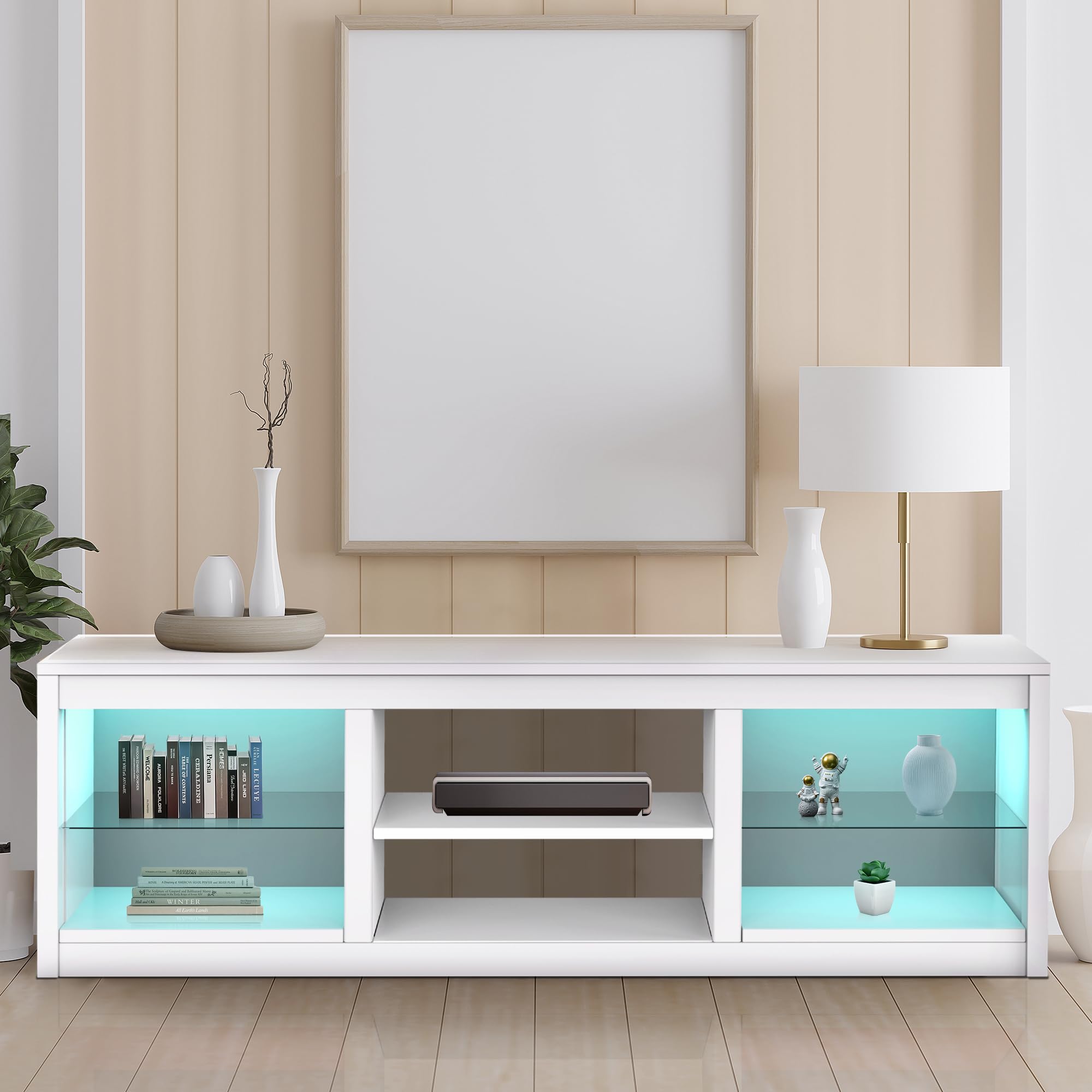 Enhance the aesthetic appeal of your home with this contemporary LED TV cabinet! This chic white console table boasts a sleek design with clean lines. Crafted from robust and resilient wood, it offers multiple LED color options to add a dash of excitement to your life. Its open storage space not only helps to maintain a neat and tidy environment but also caters to your storage needs efficiently.