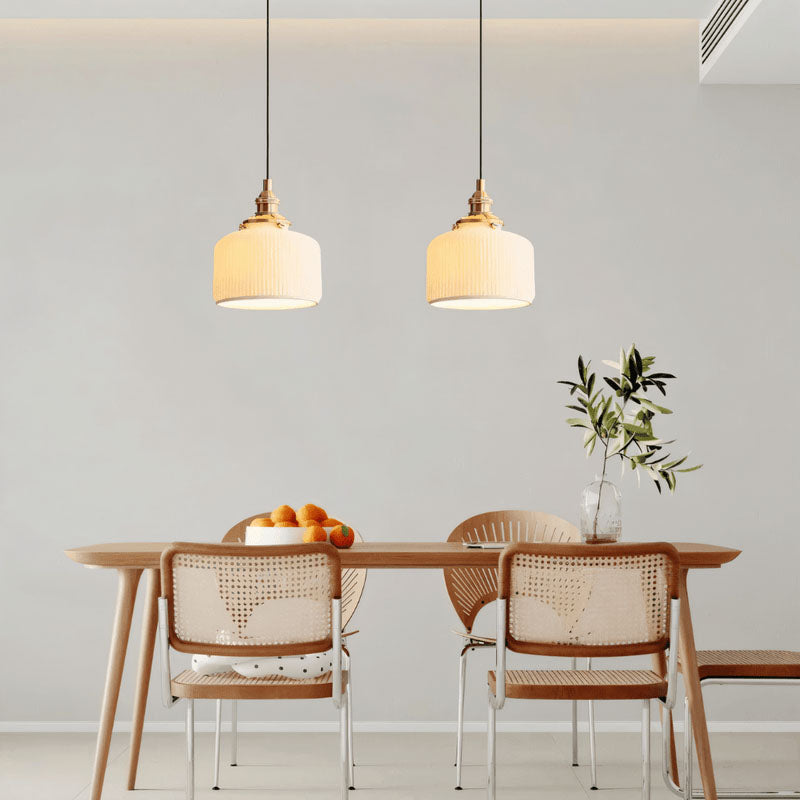Die Arla Pendelleuchte ist eine moderne Leuchte aus Kupfer und Keramik, die Langlebigkeit mit Eleganz vereint. Ihr gerippter, zylindrischer Keramikschirm streut das Licht sanft, während polierte Kupferakzente einen raffinierten Kontrast bilden. Die Leuchte ist für die Pendelmontage konzipiert und spendet gezieltes, nach unten gerichtetes Licht – ideal für Nachttische, Essbereiche oder Wohnräume. Dank ihrer zeitlosen Eleganz und funktionalen Beleuchtung ist sie eine vielseitige Wahl für moderne Interieurs.