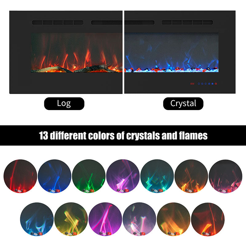 This electric fireplace features 13 adjustable flame colours, each with a brightness setting, so you can select the perfect atmosphere for any occasion. Additionally, the fireplace offers 13 fuel bed colours with a unique log and crystal effect, allowing you to customize the look to suit your mood. With 169 different flame effect combinations, this fireplace is not just a heating solution but a piece of art in your living room or bedroom.
